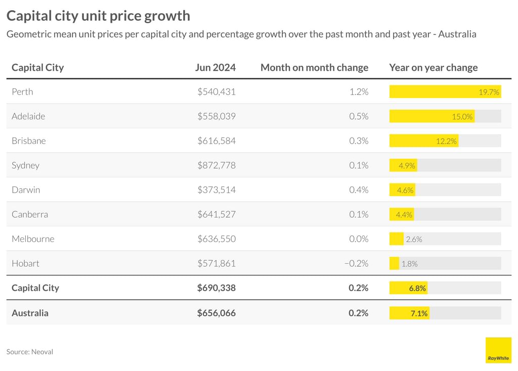 In the past month, capital city unit markets have mirrored trends seen in the housing sector. Perth leads the pack with the highest monthly growth of 1.2 per cent, translating to a 19.7 per cent annual increase and a mean price of $540,431. Adelaide has solidified its position as another growth market, rising 0.5 per cent this month, while Brisbane’s growth has been more modest at 0.3 per cent. However, annual increases in these markets have been robust, with Adelaide up 15 per cent and Brisbane up 12.2 per cent.