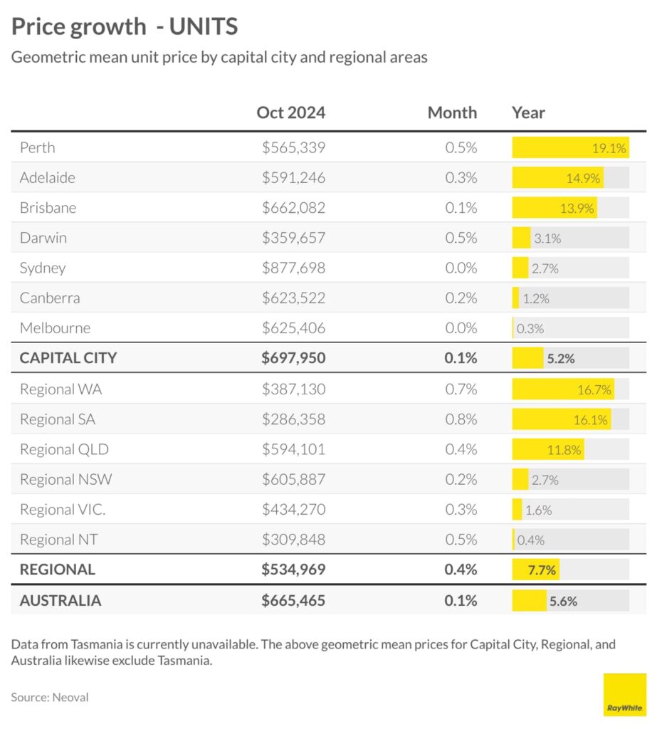 The unit market tells a similar story, though the growth isn’t quite as strong. Perth leads the capital cities here too, with unit prices up 19.1 per cent over the year. Regional areas are still showing strength, with Western Australia up 16.7 per cent and South Australia up 16.1 per cent.